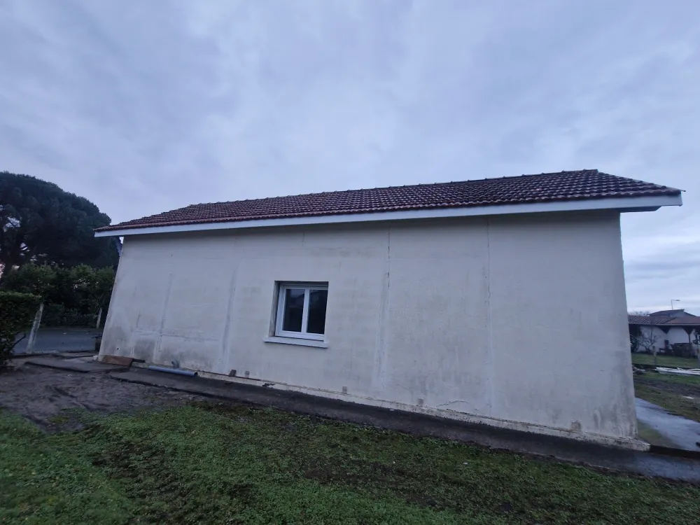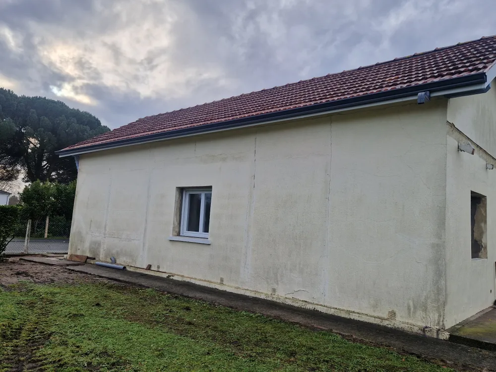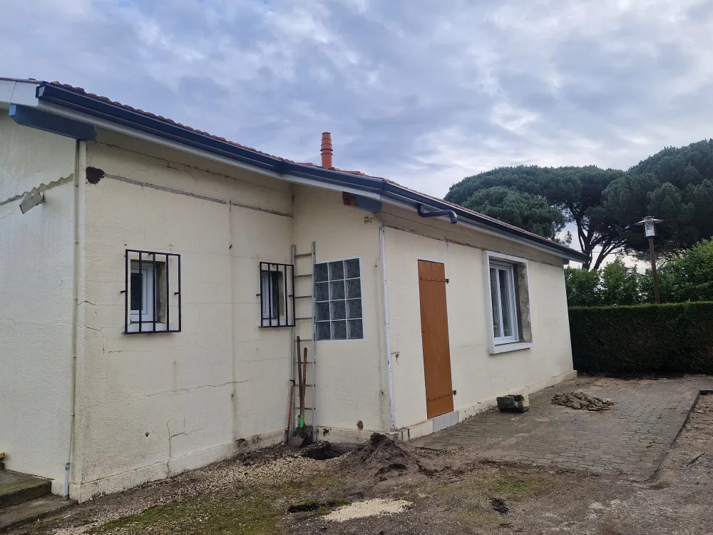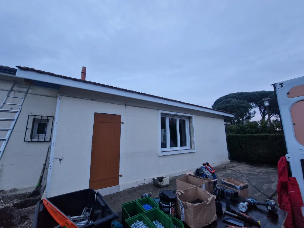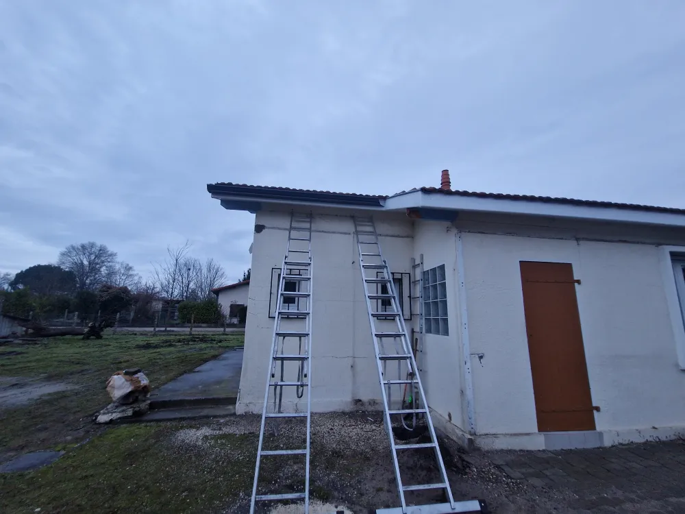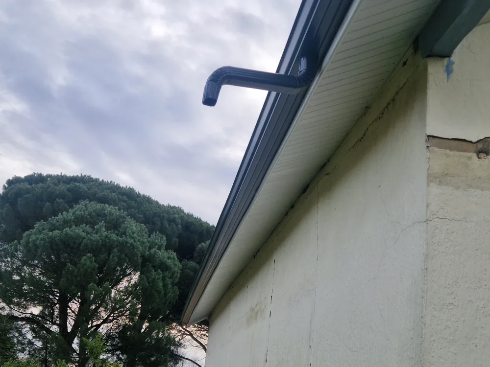 14-01-2026 Rion des landes, pose de gouttière aluminium RAL 7016 avec coude provisoire dans l'attente des canalisation d'eau pluviale sur maison en rénovation.