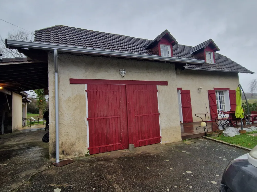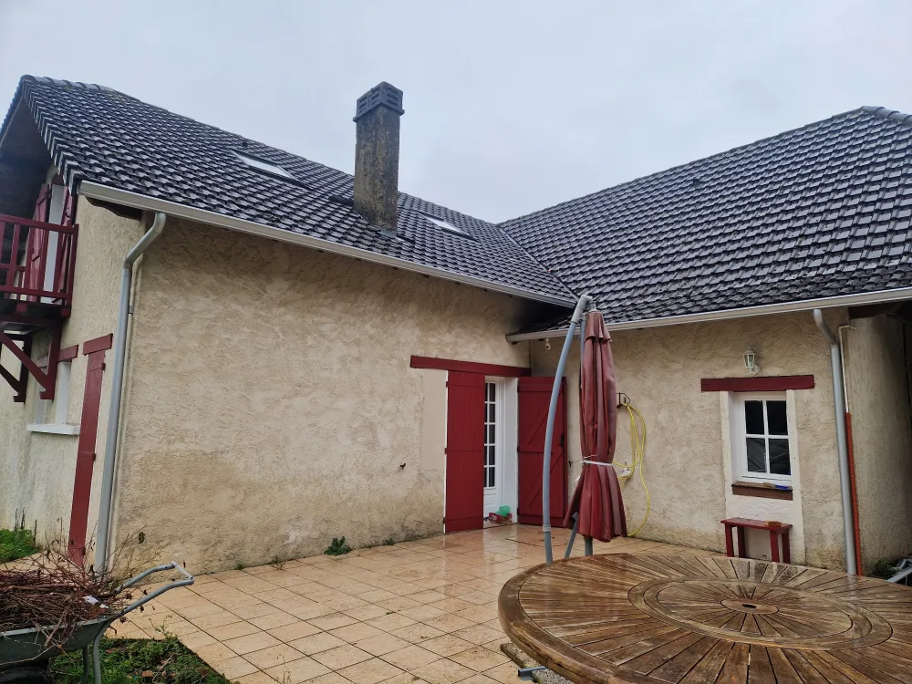 22-03-2026 Salies de Béarn, dépose ancienne gouttière zing remplacé par des gouttières aluminium RAL 9006 GRIS. Avec descente ronde aluminium 9006.
