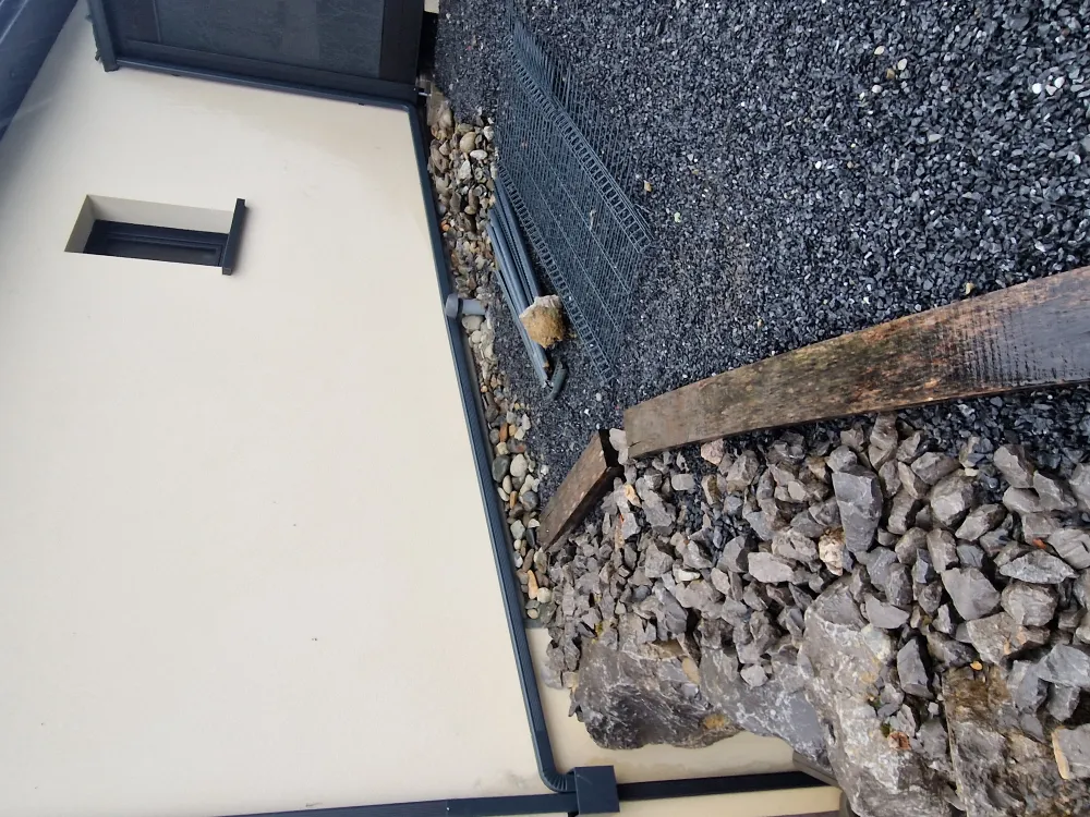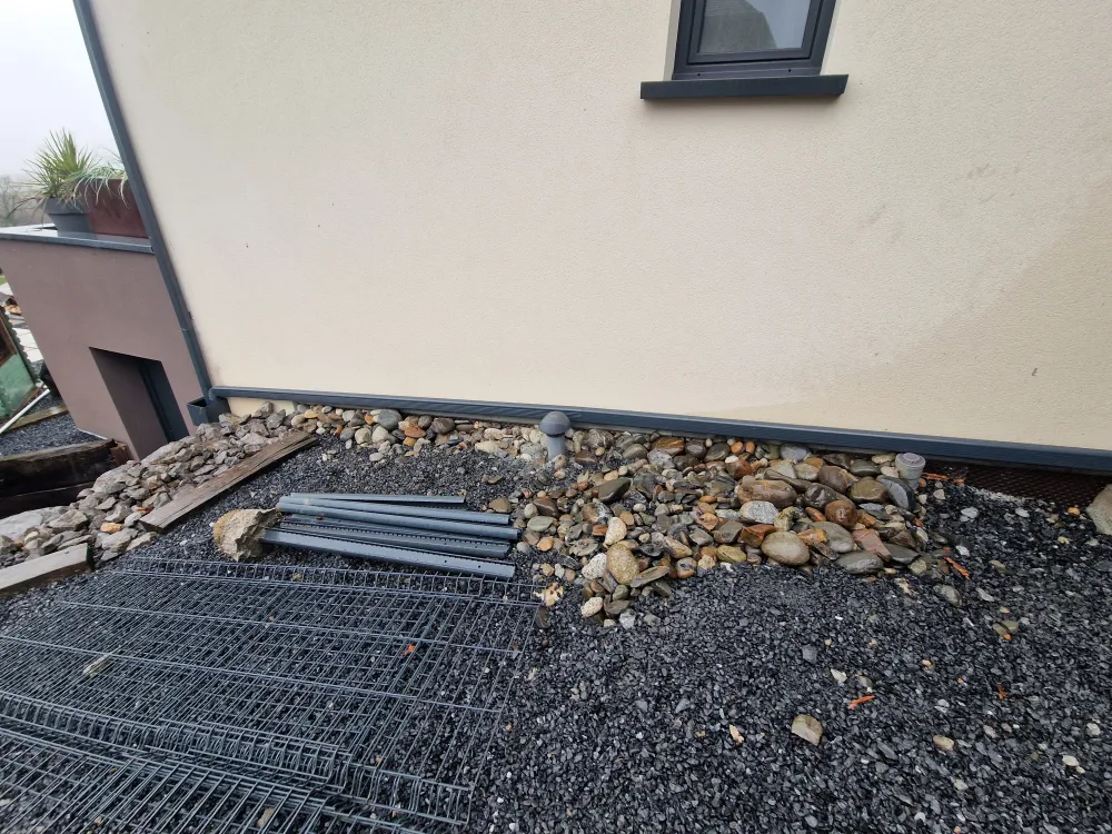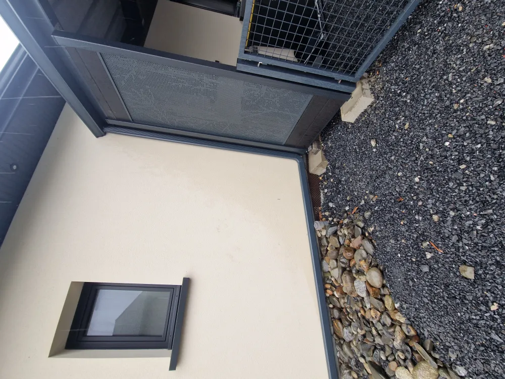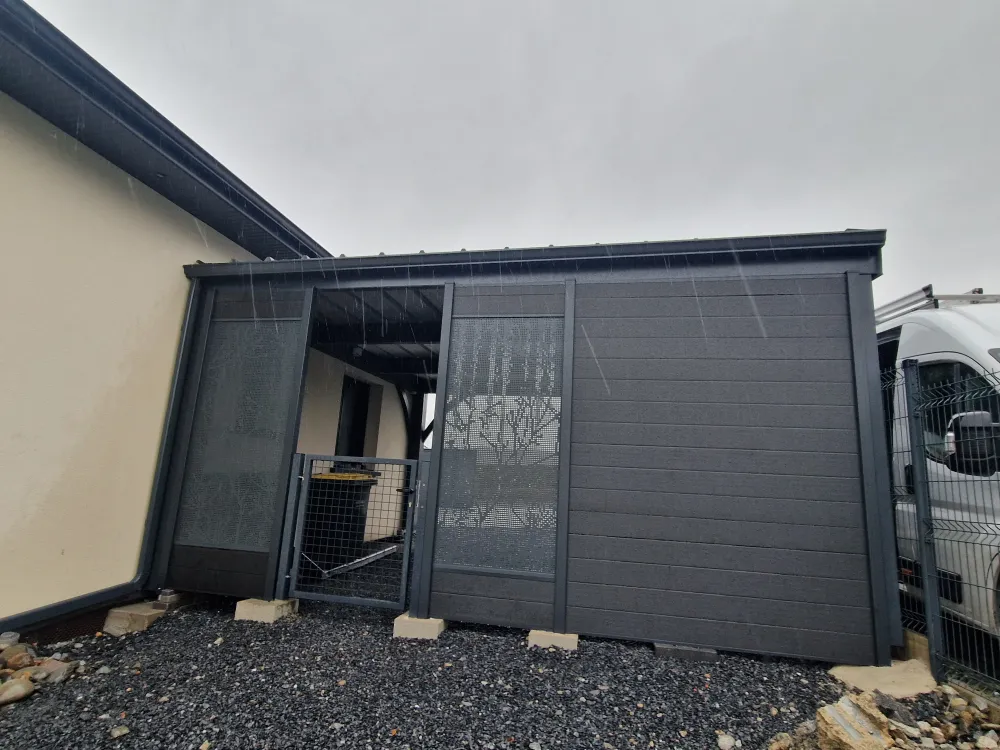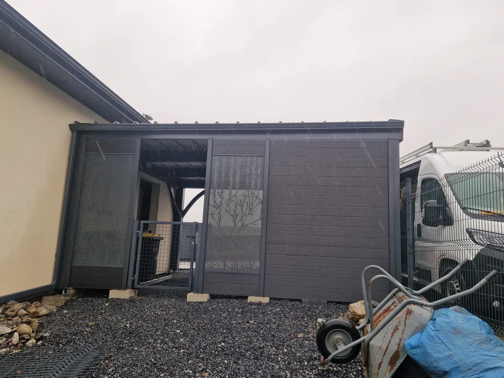 12-01-2026 Remplacez moi par votre texte... Sauvagnon (64), gouttière aluminium gris anthracite sur carport avec raccordement sur descente existante avec boite à eau .